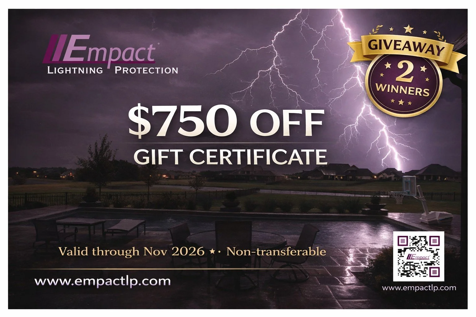 NO PURCHASE NECESSARY TO ENTER OR WIN. A PURCHASE DOES NOT INCREASE THE CHANCES OF WINNING. This giveaway is sponsored and administered by Empact Lightning Protection (“Sponsor”), located in Oklahoma City, Oklahoma. This promotion is in no way sponsored, endorsed, administered by, or associated with Facebook. The giveaway is open to individuals who are 18 years of age or older at the time of entry and are legal residents within the Sponsor’s service area, defined as the State of Oklahoma. Employees, affiliates, and immediate family members of the Sponsor may be excluded from participation. The giveaway begins on April 13, 2026 and ends on May 4, 2026 at 11:59 PM local time. Winners will be announced on May 6, 2026 or within a reasonable timeframe thereafter. Entries submitted outside of this period will not be eligible. To enter, participants must like the official giveaway post on Facebook and follow the Sponsor’s Facebook page. Participants are encouraged, but not required, to comment with a charity or outreach organization they would like to support and to share the giveaway post. Limit one (1) entry per person. Duplicate, automated, or fraudulent entries may be disqualified at the sole discretion of the Sponsor. Two (2) winners will be selected at random from all eligible entries. Each winner will receive one (1) $750 OFF Gift Certificate applicable toward services offered by Empact Lightning Protection. The certificate is non-transferable, has no cash value, and may not be exchanged for cash or substituted. The certificate must be used in accordance with the Sponsor’s service terms and is valid throughout 2026 or as otherwise stated on the certificate. Winners will be announced publicly on the Sponsor’s Facebook page and may be contacted via comment reply and/or direct message. If a selected winner does not respond within 48–72 hours, the Sponsor reserves the right to select an alternate winner. As part of this giveaway, the Sponsor will make a donation to a charity or outreach organization selected by each winner. The selected organization must be a verified nonprofit organization and must align with the Sponsor’s mission and values. Organizations must align with our mission and values; eligibility will be determined at our discretion. If a selected organization is deemed ineligible, the winner may be required to select an alternative organization. The Sponsor reserves the right to cancel, suspend, or modify the giveaway if fraud, technical failures, or any other factor impairs the integrity or proper functioning of the promotion. The Sponsor reserves the right to disqualify any individual found to be tampering with the entry process or violating these terms. By participating, entrants agree to be bound by these Terms and Conditions and agree to allow the Sponsor to use their name, likeness, and entry for promotional purposes where permitted by law. The Sponsor is not responsible for lost, late, incomplete, invalid, unintelligible, or misdirected entries, which will be disqualified. The Sponsor is not responsible for technical failures of any kind, including but not limited to malfunctions, interruptions, or disconnections in network hardware or software. The Sponsor is not responsible for any injury or damage to persons or property which may be caused, directly or indirectly, in whole or in part, from participation in the giveaway or receipt or use of any prize. Any personal information collected will be used solely for the administration of this giveaway and will not be sold or shared with third parties except as necessary to fulfill the prize or as required by law. This giveaway is governed by the laws of the State of Oklahoma, without regard to conflict of law principles. By entering, participants fully and unconditionally agree to these Terms and Conditions. For questions regarding this giveaway, please contact the Sponsor directly through available contact methods.